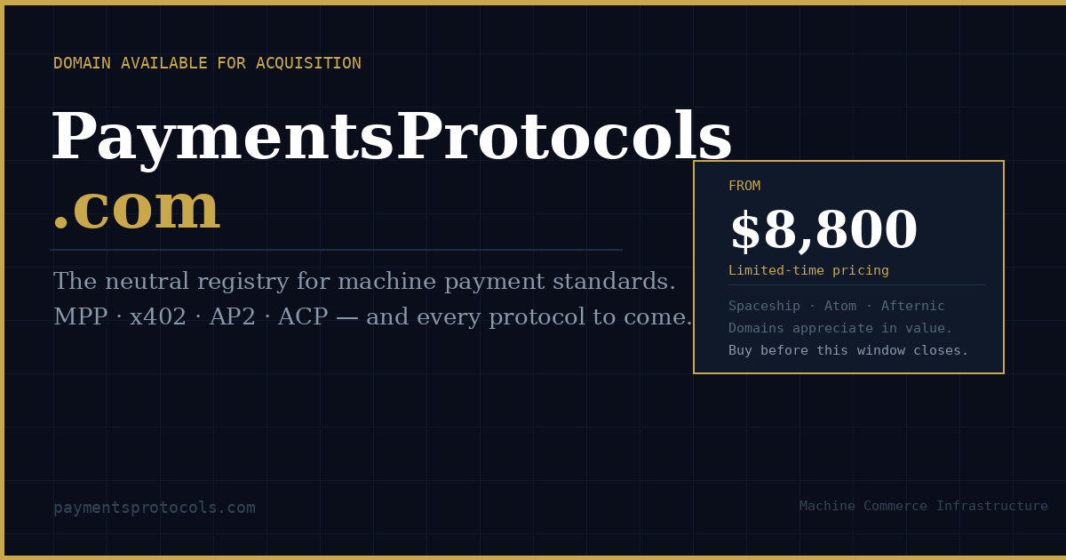 No single standard has won. MPP, x402, and AP2 are simultaneous bets on different architectures. A domain named after none of them — but encompassing all of them — captures the category regardless of outcome. The war's winner inherits the name's authority.